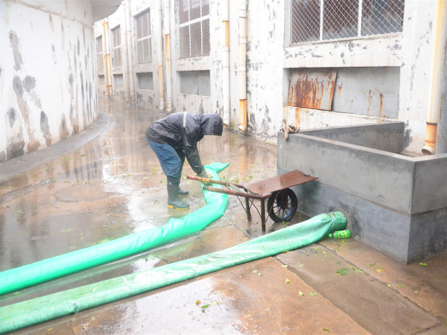 8月10日,臺(tái)風(fēng)帶來的強(qiáng)降水洶洶而至。公司黨委書記、董事長王力民到公司各處巡查督導(dǎo),防汛應(yīng)急小組成員各就各位,各部門按職能分工,全力以赴投入到鏖戰(zhàn)“利奇馬”這場硬仗當(dāng)中。為了防止雨水進(jìn)入生產(chǎn)車間,各車間在提前安裝好防水擋板、壘砌防汛沙袋基礎(chǔ)上,每個(gè)出入口都安排專人看護(hù),對(duì)出現(xiàn)漏水、漏電等情況及時(shí)采取措施。在生產(chǎn)現(xiàn)場,相關(guān)設(shè)備人員及時(shí)檢查電源柜、防汛泵等設(shè)備,保障正常運(yùn)行;提前增加的安全照明裝置,有效增強(qiáng)了臺(tái)風(fēng)期間的現(xiàn)場亮度。針對(duì)室外積水積水較深這一情況,開啟防汛泵,將積水排入雨水管道,對(duì)積水超過100㎜后安插警示標(biāo)識(shí),并且擺放防汛凳,保障員工安全出入;對(duì)外圍排水口及下水管道及時(shí)沖洗、清理,以避免廠區(qū)積水影響到生產(chǎn)運(yùn)行。