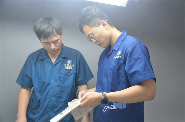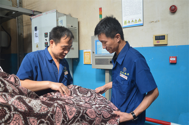 花布車間現(xiàn)場(chǎng)主管紀(jì)方超(右)與焙烘機(jī)機(jī)長(zhǎng)孫海雷,在查看金粉印花生產(chǎn)質(zhì)量。