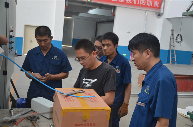家紡車間卞兆穩(wěn)(右一)等人,正在為印花機(jī)安裝新配件。