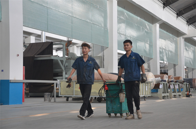 家紡車間丙班水洗機(jī)新員工劉叢叢(左),正在接受師傅的現(xiàn)場(chǎng)培訓(xùn)與指導(dǎo)。