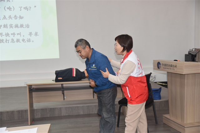 培訓(xùn)課上,王燕老師首先介紹了紅十字運動的基本知識,隨后重點針對日常生活中較為常見的意外事故,向在場員工詳細講解,并演示了創(chuàng)傷救護、氣道異物梗阻急救、海姆立克急救法、心肺復(fù)蘇及包扎固定等急救技能和相關(guān)知識。
