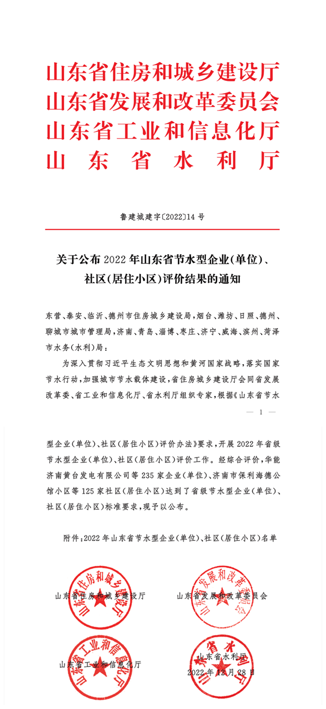 近日,山東省住房和城鄉(xiāng)建設(shè)廳會同山東省發(fā)展和改革委員會、山東省工業(yè)和信息化廳、山東省水利廳發(fā)布了《關(guān)于公布2022年山東省節(jié)水型企業(yè)(單位)、社區(qū)(居住小區(qū))評價結(jié)果的通知。經(jīng)綜合評價,公司達(dá)到了省級節(jié)水型企業(yè)的標(biāo)準(zhǔn)要求,獲評山東省節(jié)水型企業(yè)。