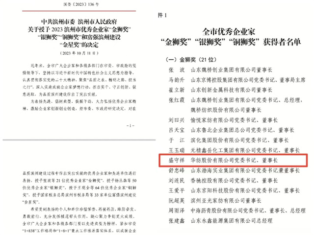 會上,對在品質濱州建設過程中作出突出貢獻的優(yōu)秀企業(yè)家和先進單位進行了表彰頒獎,公司黨委書記、董事長盛守祥先生榮獲2023濱州市優(yōu)秀企業(yè)家“金獅獎”。