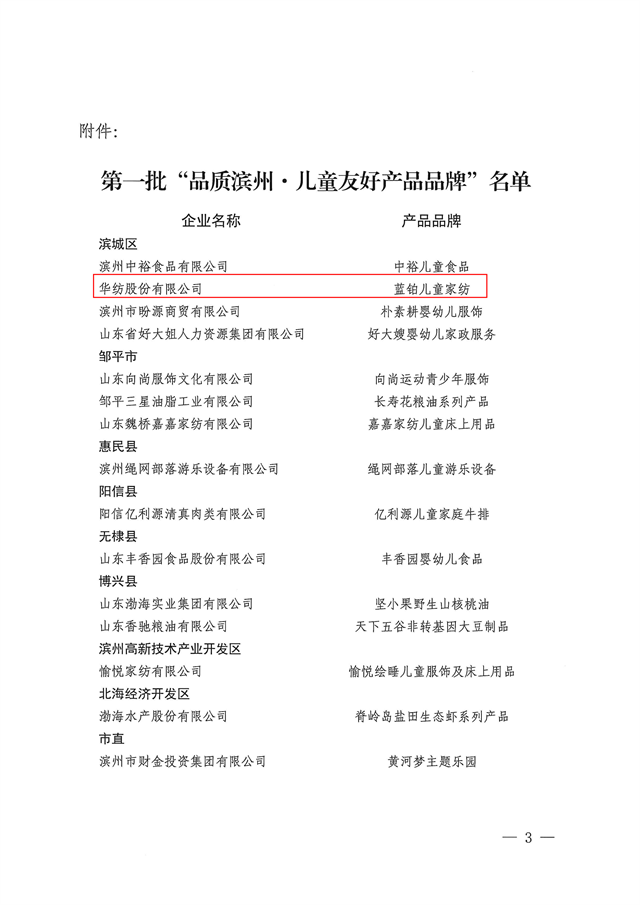 近日,市發(fā)展改革委、市婦聯(lián)、市市場(chǎng)監(jiān)管局聯(lián)合發(fā)布第一批“品質(zhì)濱州·兒童友好產(chǎn)品品牌”名單,公司藍(lán)鉑兒童家紡憑借卓越的品質(zhì)與貼心的設(shè)計(jì)成功入選。