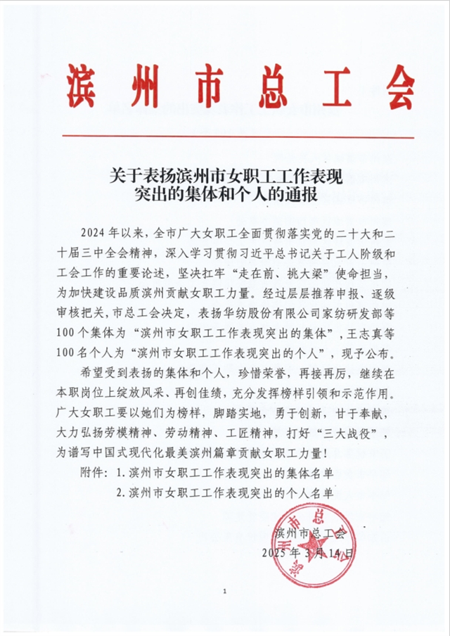 近日,濱州市總工會(huì)公布《關(guān)于表揚(yáng)濱州市女職工工作表現(xiàn)突出的集體和個(gè)人的通報(bào)》文件,家紡研發(fā)部憑借卓越的工作表現(xiàn)和突出貢獻(xiàn),榮獲“濱州市女職工工作表現(xiàn)突出的集體”榮譽(yù)稱號(hào)。