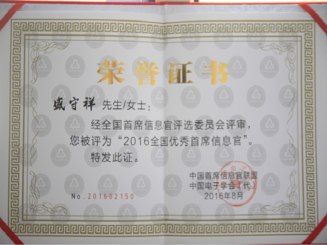 日前,中國首席信息官聯(lián)盟、中國電子學會對“2016年度全國優(yōu)秀首席信息官”評審結(jié)果進行了表彰,公司副總經(jīng)理盛守祥以在推進“數(shù)字華紡”“智慧華紡”建設(shè)方面的卓異業(yè)績,獲得這一殊榮。