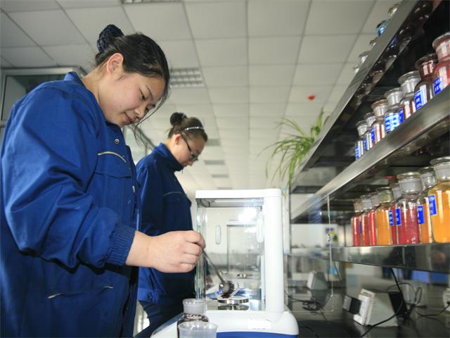 圖為公司花二車(chē)間技術(shù)人員在進(jìn)行顏色配比。