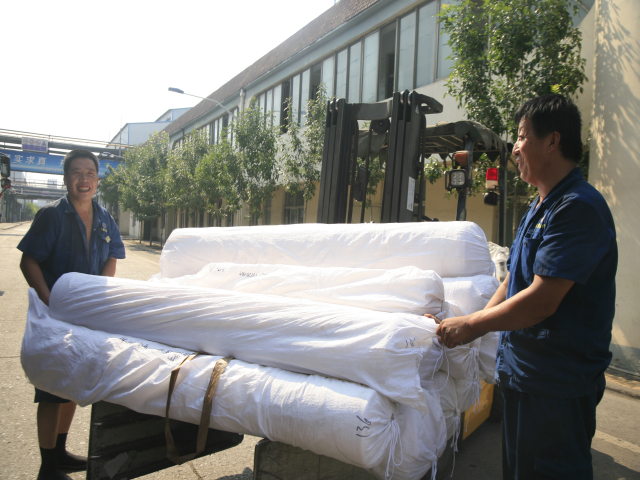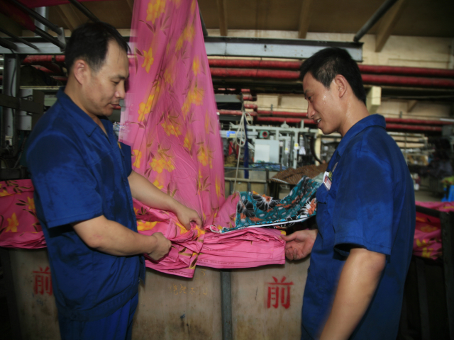 家紡車間前處理340絲光機出檢工李娟(圖左)與前來推布的360拉幅機進檢工朱濤交接產品。李娟說:“天氣越熱,我們越要互相提示,注重細節(jié),保證安全,保證品質。”