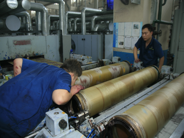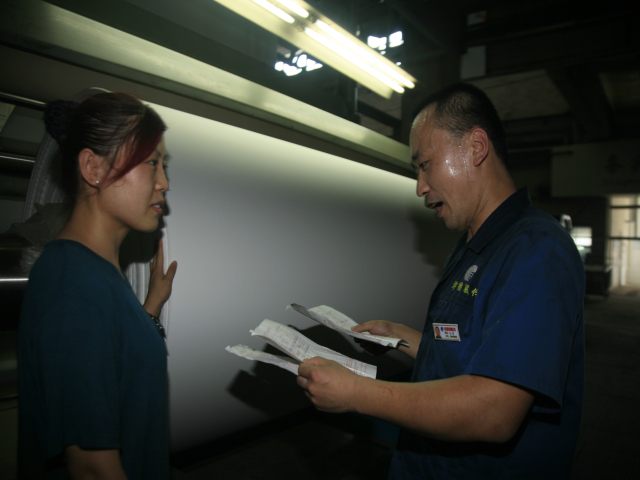 花一車間后處理技術員張延軍(圖右)與軋光機機長吳秀祝在交流生產情況。他倆表示,每一米優(yōu)質產品都是靠專注認真干出來的。