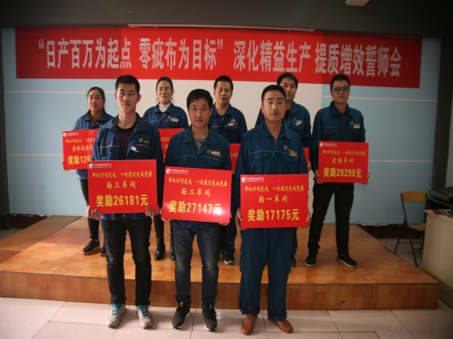3月3日,公司召開主題為“日產(chǎn)百萬為起點(diǎn)、零疵布為目標(biāo)”深化精益生產(chǎn)、提質(zhì)增效誓師大會,公司高管、分公司經(jīng)理、業(yè)務(wù)經(jīng)理、車間主任、職能部室主任、輪班長、技術(shù)員和機(jī)組長代表近200人參加會議。會上,公司黨委書記、董事長王力民為今年1-2月份各車間“單機(jī)計(jì)劃完成率”、“一次通過率”競賽優(yōu)秀機(jī)臺代表頒發(fā)獎勵(lì)牌,并圍繞進(jìn)一步強(qiáng)化精益生產(chǎn)做重要講話;總經(jīng)理閆英山對精益生產(chǎn)執(zhí)行情況,特別是今年1-2月份情況進(jìn)行了深入分析總結(jié),提出了新的任務(wù)與目標(biāo)。